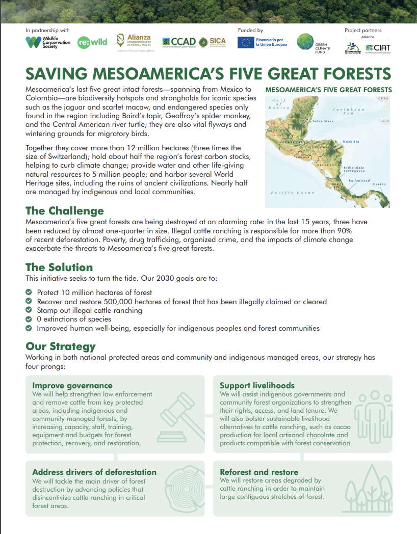 Mesoamerica’s last five great intact forests—spanning from Mexico to Colombia—are biodiversity hotspots and strongholds for iconic species such as the jaguar and scarlet macaw, and endangered species only found in the region including Baird’s tapir, Geoffroy’s spider monkey, and the Central American river turtle; they are also vital flyways and wintering grounds for migratory birds.