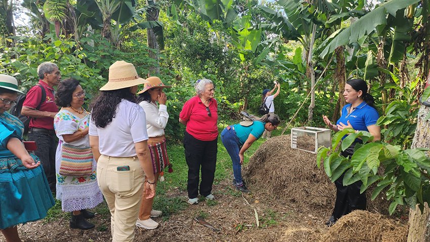During their stay at CATIE, the leaders had the opportunity to visit the agro-silvopastoral goat 🐐module, a prominent project within the AGROINNOVA initiative. This comprehensive approach not only promotes sustainable goat production and food security but also fosters climate resilience and circular economy in rural communities, supporting the inclusion of women and youth in agricultural activities. The delegation comprised a diverse mix of farming families, medium-scale producers, peasants, indigenous community members, teachers, cooperative promoters, students and community leaders, all united by a common interest in driving innovation and sustainability in the field.