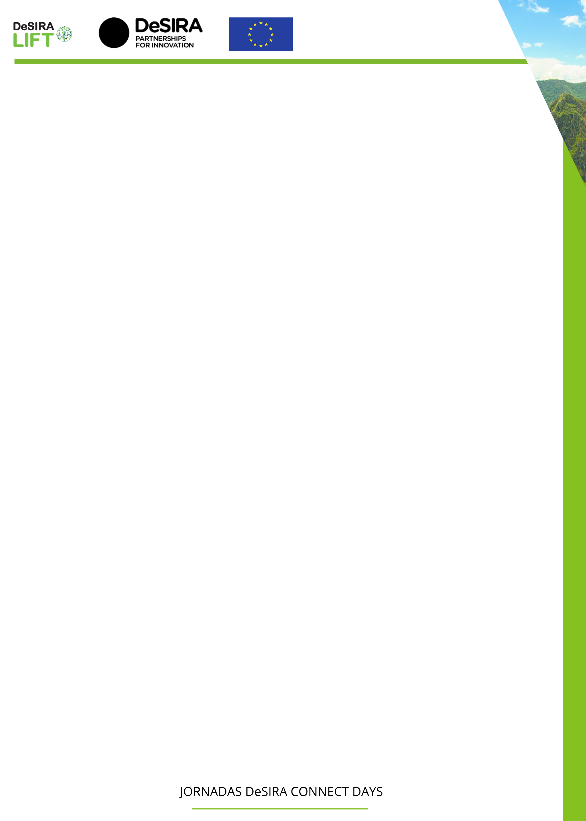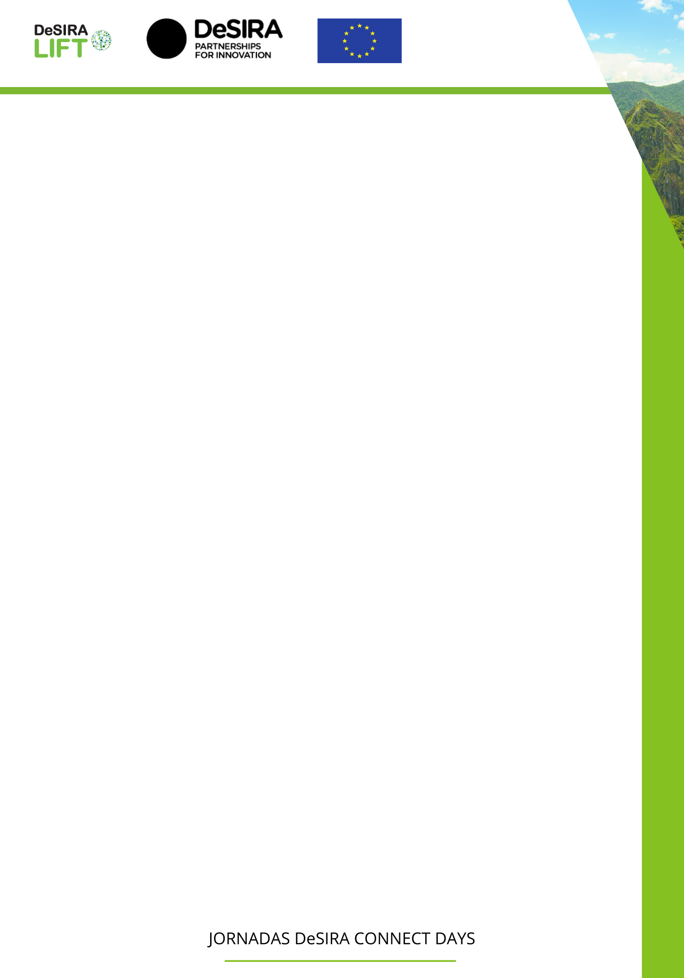 El objetivo de estas jornadas es compartir lo aprendido en la implementación de los proyectos DeSIRA e identificar las condiciones para continuar sus trayectorias de innovación. Por lo tanto, el evento ofrecerá tres tipos de actividades: puntos de encuentro en los que participantes podrán promover y debatir sus proyectos, talleres entre proyectos para aprender juntos de la aplicación de DeSIRA, y mesas redondas con otras partes interesadas destinadas a continuar las trayectorias de innovación de sus proyectos. Cada actividad estará diseñada para alimentar a las demás.