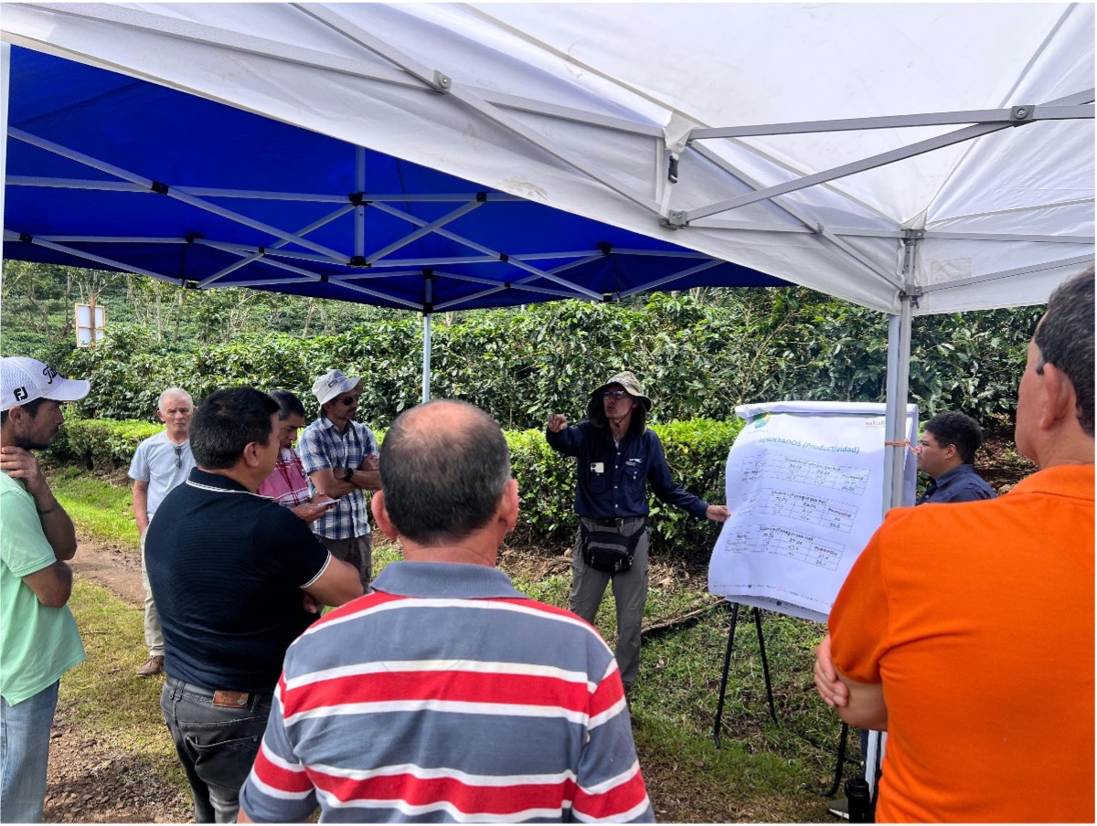 Ing. Diana Espinoza (ICAFE) and M.Sc. Chelsia Moraes (CATIE) presented preliminary results on pruning techniques and coffee varieties at two of the four farms under study. Key achievements include: